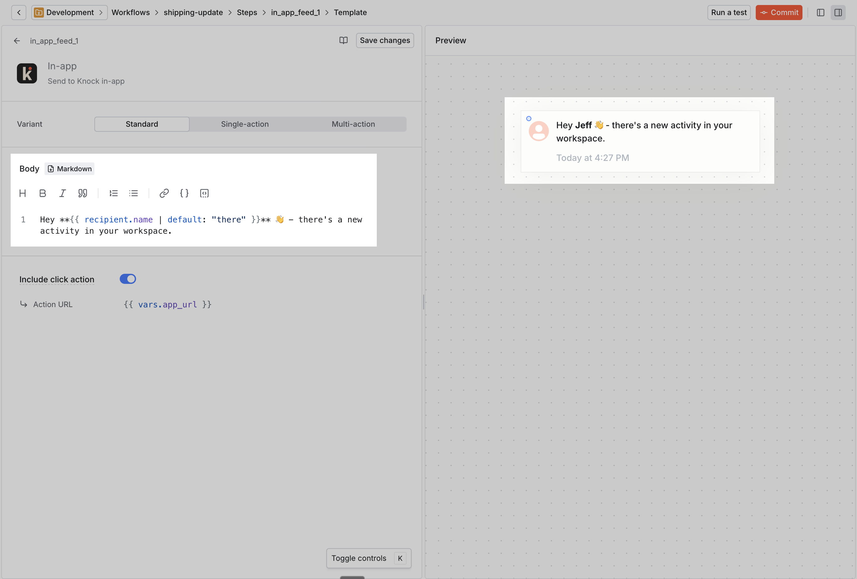 After adding your channel step, you can configure the notification's content by clicking on "Edit content" in the channel's edit step view to see that step's message template.